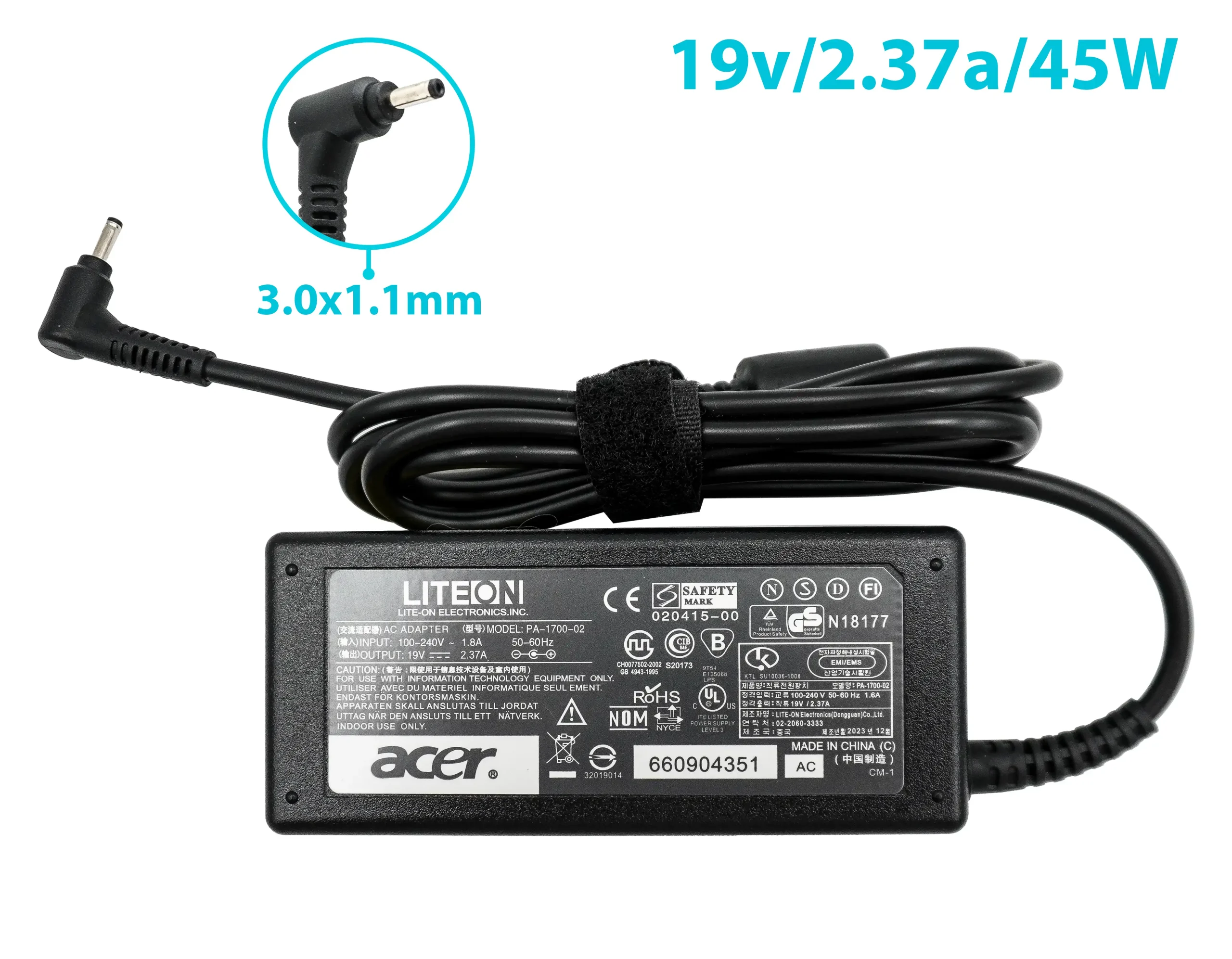 Este cargador de 45W es compatible con laptops Acer, ofreciendo una salida de 19V y 2.37A para un suministro de energía confiable. Su diseño compacto y portátil facilita su transporte, ideal para estudiantes y profesionales en movimiento. Incluye protección contra sobrecargas, cortocircuitos y sobrecalentamiento, asegurando seguridad y durabilidad. Es una solución práctica para mantener tu laptop siempre cargada y lista para usarse.