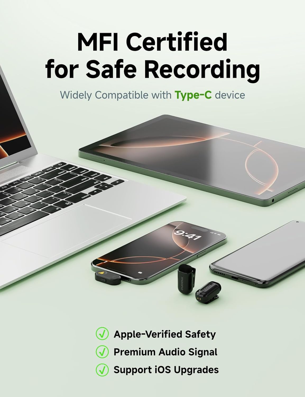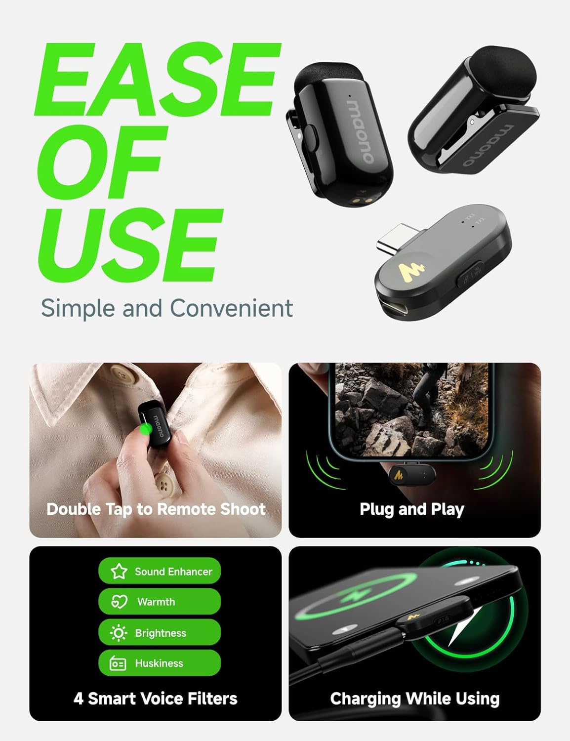 El MAONO Wave T1 Mini es un micrófono inalámbrico tipo lavalier diseñado para ofrecer una experiencia de grabación profesional en un formato compacto. Con resolución de 48kHz/16bit, captura audio detallado y enriquecido. Su tecnología de cancelación de ruido AI de 4 niveles, junto con el control de ganancia de 32 dB y la función de limitación automática inteligente, garantiza grabaciones nítidas incluso en entornos ruidosos. La batería ofrece hasta 30 horas de uso con el estuche de carga incluido, y permite cargar el dispositivo mientras se graba. La transmisión estable de hasta 100 metros asegura una conexión sin interrupciones. Compatible con dispositivos iOS y Android, incluye un receptor USB-C con certificación MFi. Además, mediante la aplicación Maono Link, puedes acceder a filtros y efectos de voz con AI para personalizar tu audio en tiempo real. Ideal para vlogging, entrevistas, transmisiones en vivo y más.