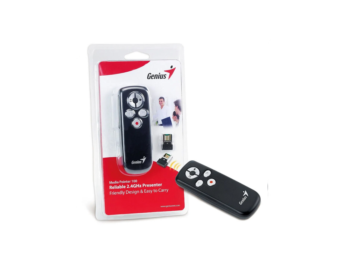 El Genius Media Pointer 100 es una herramienta inalámbrica ideal para presentaciones profesionales y dinámicas. Opera en la banda de 2.4 GHz, permitiéndote controlar tus diapositivas a una distancia de hasta 10 metros sin interferencias. Incorpora un puntero láser rojo para resaltar contenido en pantalla, y su receptor USB tipo pico se guarda dentro del dispositivo para facilitar el transporte y reducir la pérdida. Dispone de cinco botones intuitivos que permiten navegar entre diapositivas, activar pantalla en blanco, cambiar a pantalla completa, y usar funciones ESC/F5 para control adicional. Funciona con dos pilas AAA (incluidas) y ofrece configuración plug-and-play con Windows (8, 10, 11) y Mac OS (10.8+). Compacto y ligero (aprox. 157 g), es fácil de usar y transportar, ideal para presentaciones en aulas, conferencias o reuniones.